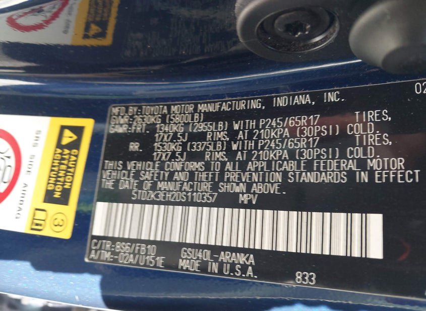 - VIN: 5TDZK3EH2DS110357