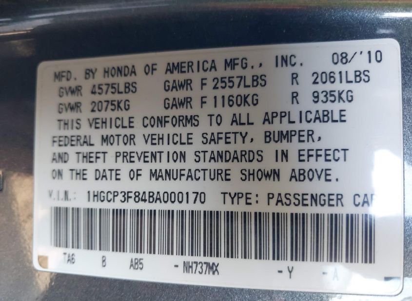 - VIN: 1HGCP3F84BA000170