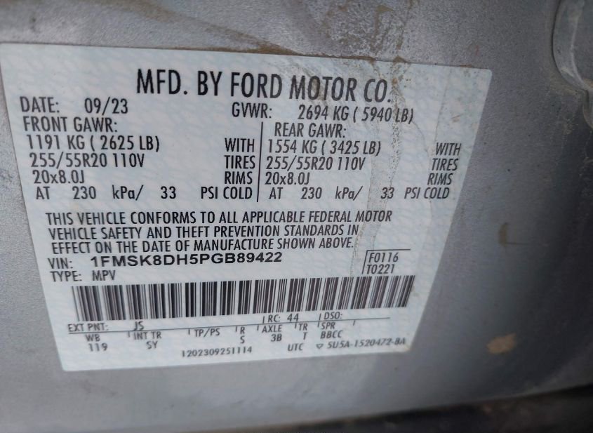 - VIN: 1FMSK8DH5PGB89422