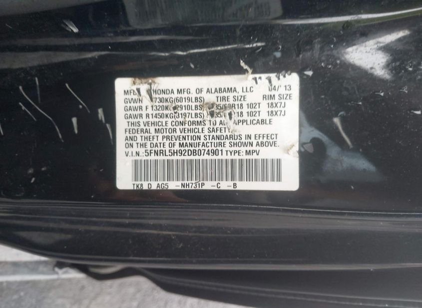 - VIN: 5FNRL5H92DB074901