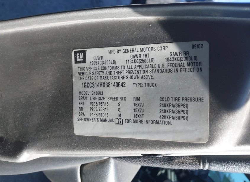 - VIN: 1GCCS14HX38140642