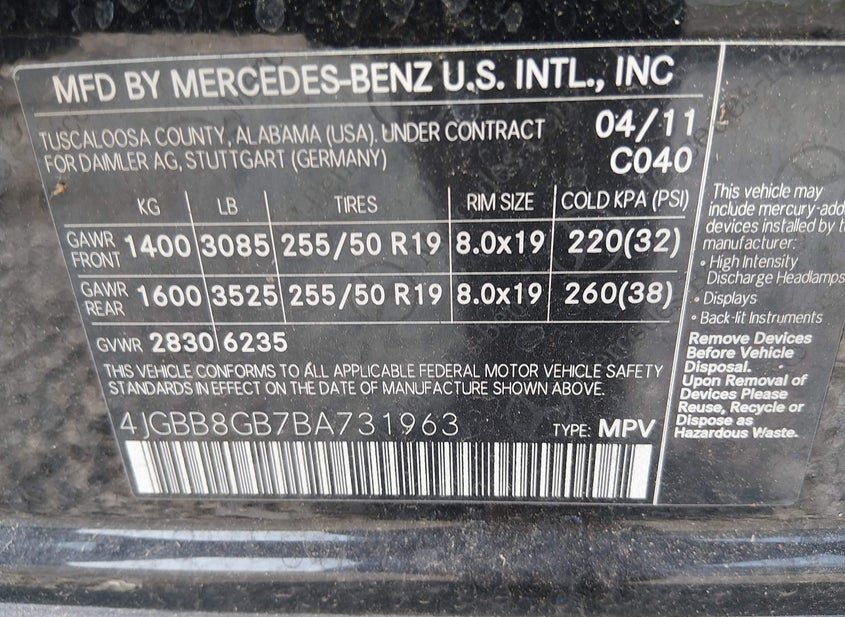 - VIN: 4JGBB8GB7BA731963