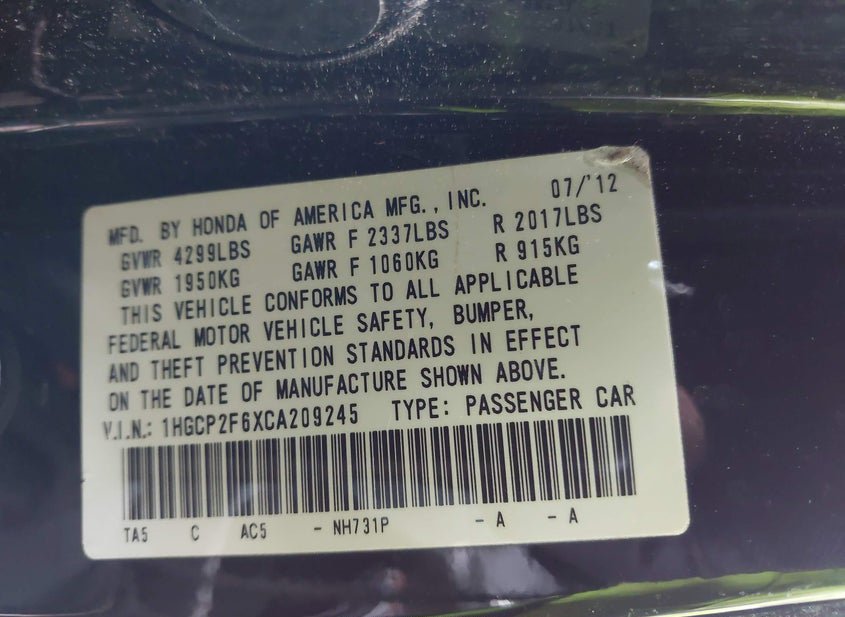 - VIN: 1HGCP2F6XCA209245