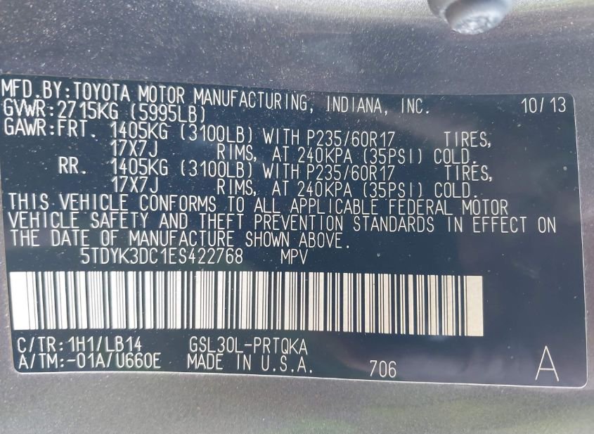 - VIN: 5TDYK3DC1ES422768