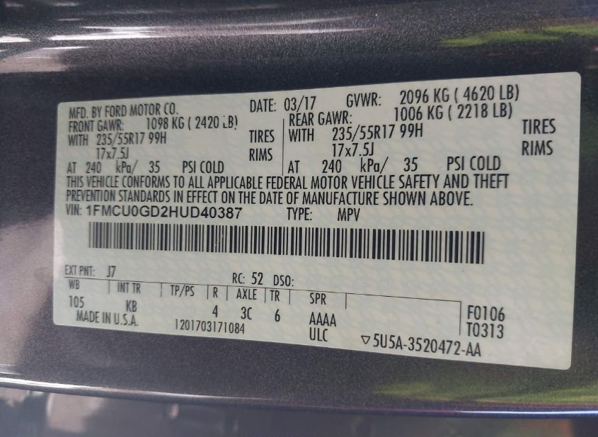 - VIN: 1FMCU0GD2HUD40387