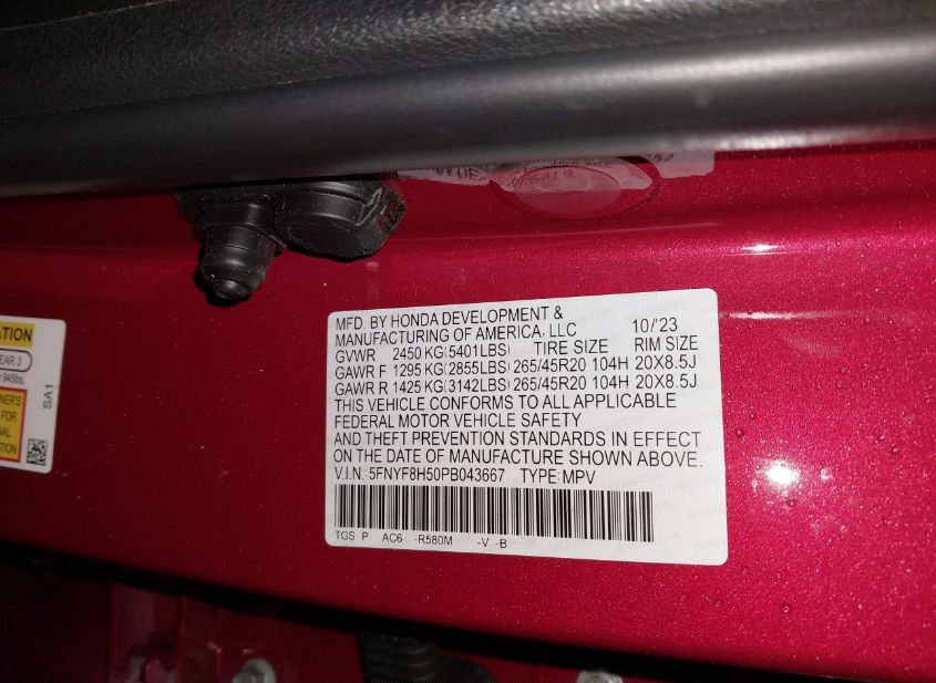 - VIN: 5FNYF8H50PB043667