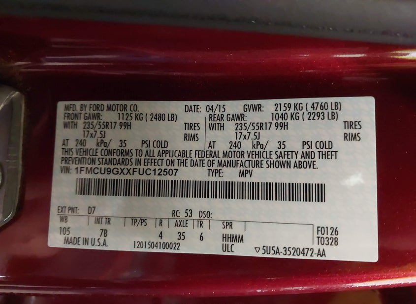 - VIN: 1FMCU9GXXFUC12507