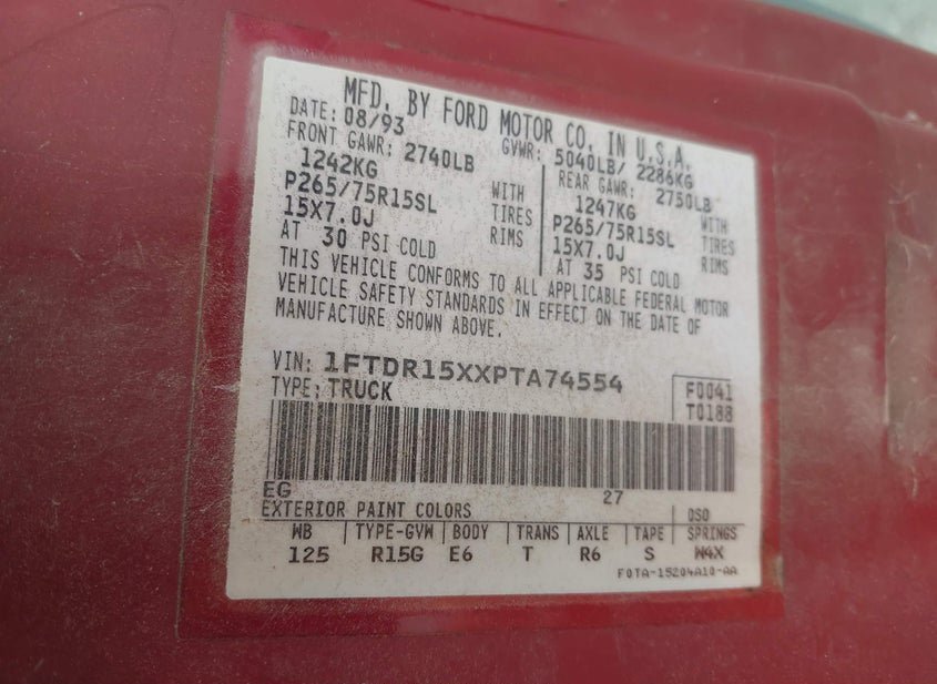 - VIN: 1FTDR15XXPTA74554