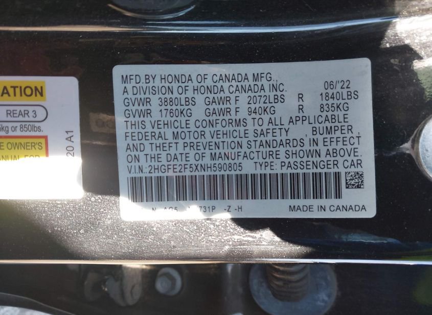 - VIN: 2HGFE2F5XNH590805