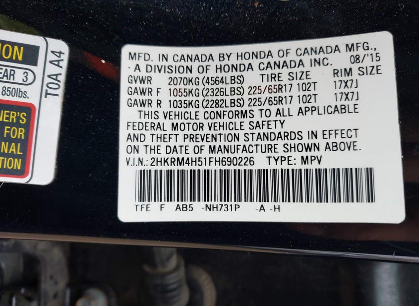 - VIN: 2HKRM4H51FH690226