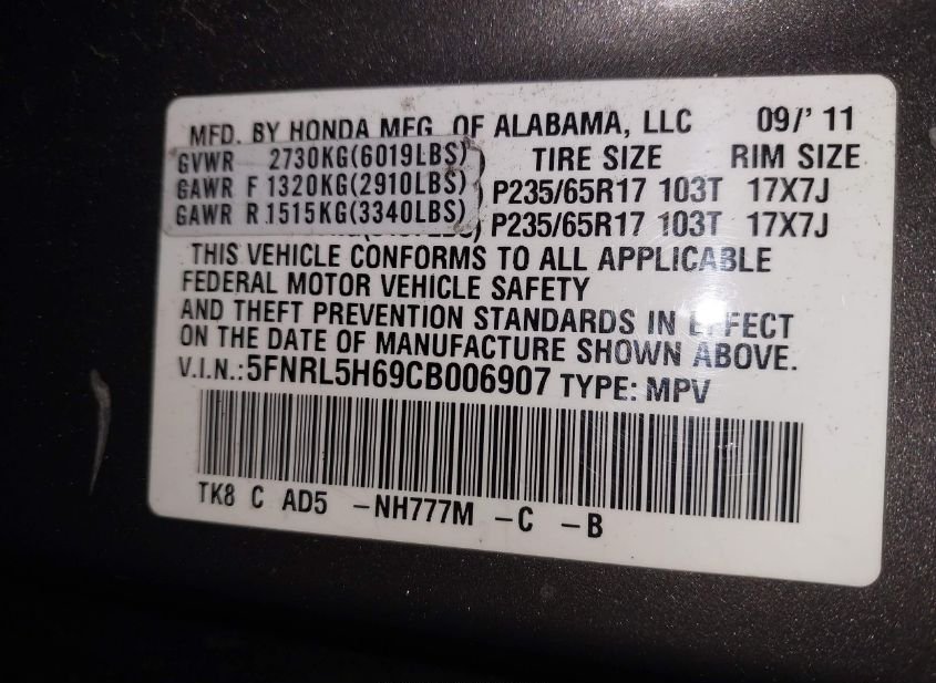 - VIN: 5FNRL5H69CB006907