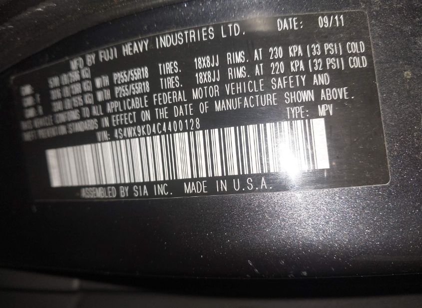 - Название лота: 2012 SUBARU TRIBECA 3.6R TOURING