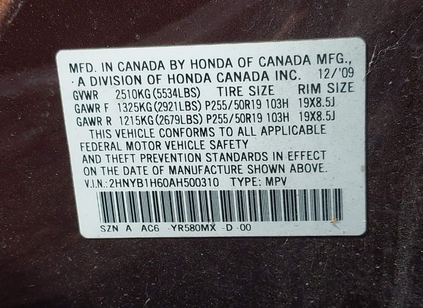 - VIN: 2HNYB1H60AH500310