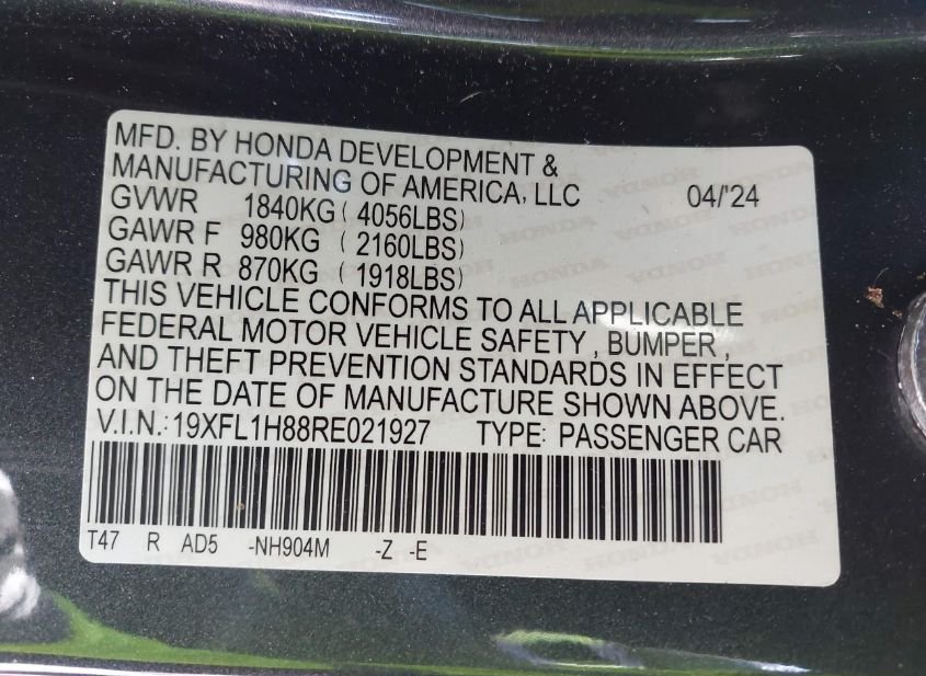 - VIN: 19XFL1H88RE021927