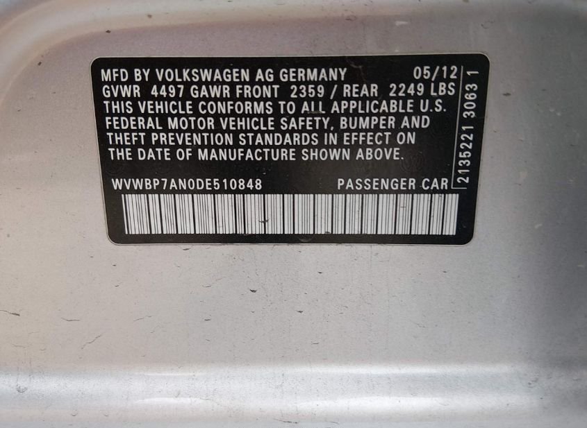 - VIN: WVWBP7AN0DE510848