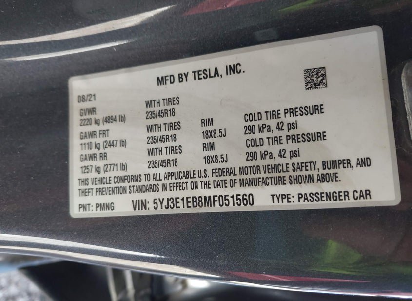 - VIN: 5YJ3E1EB8MF051560