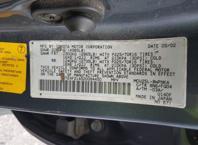 - Название лота: 2002 TOYOTA HIGHLANDER V6