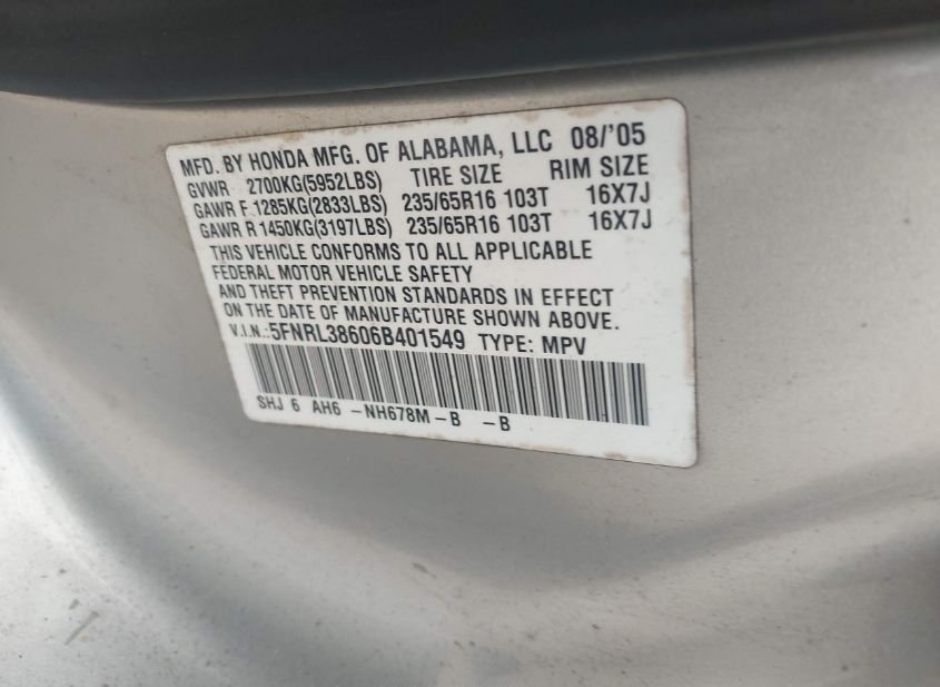 - VIN: 5FNRL38606B401549