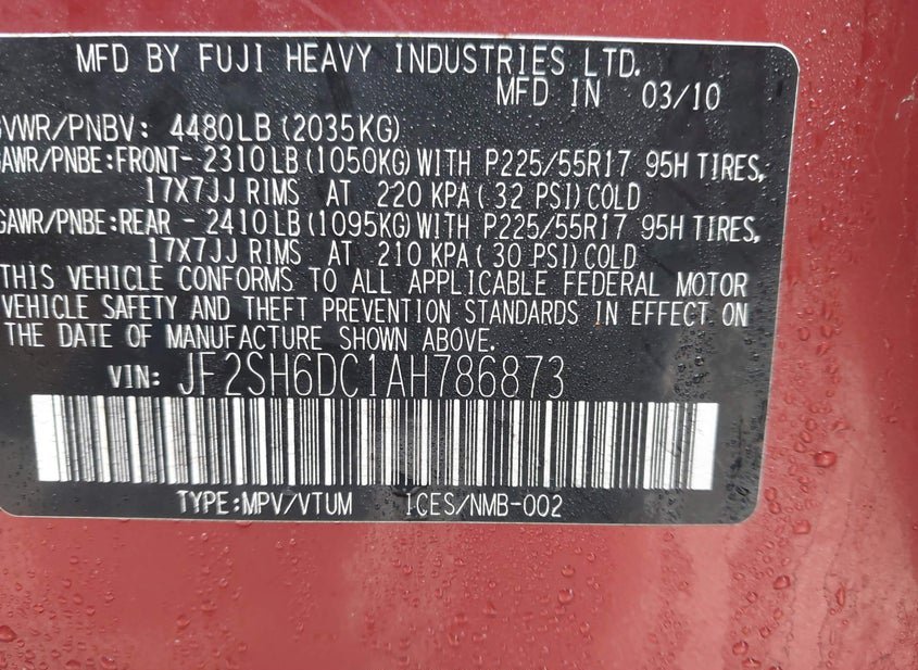 - VIN: JF2SH6DC1AH786873