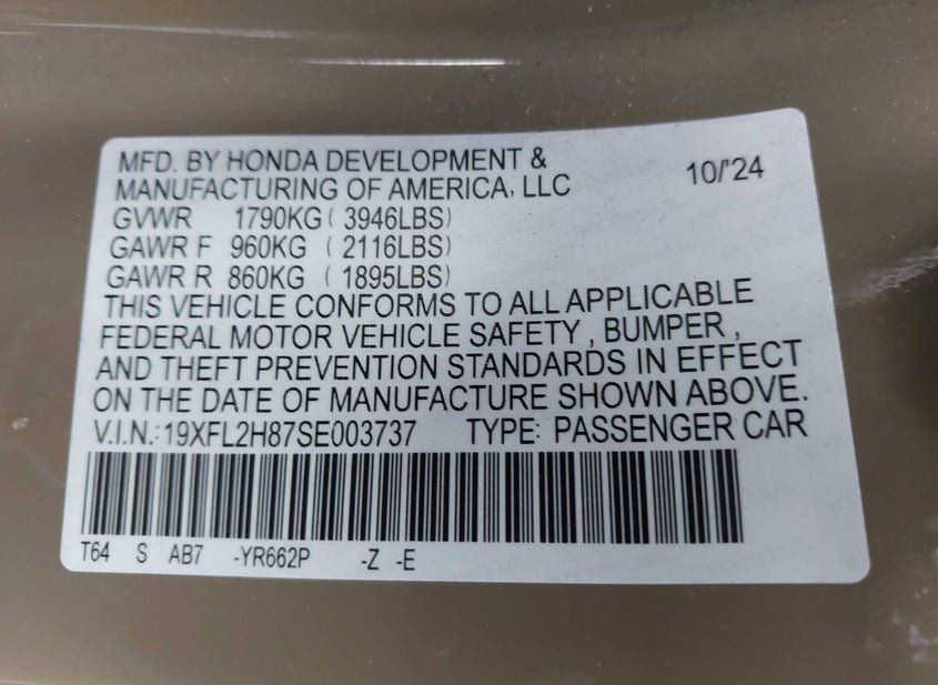 - VIN: 19XFL2H87SE003737