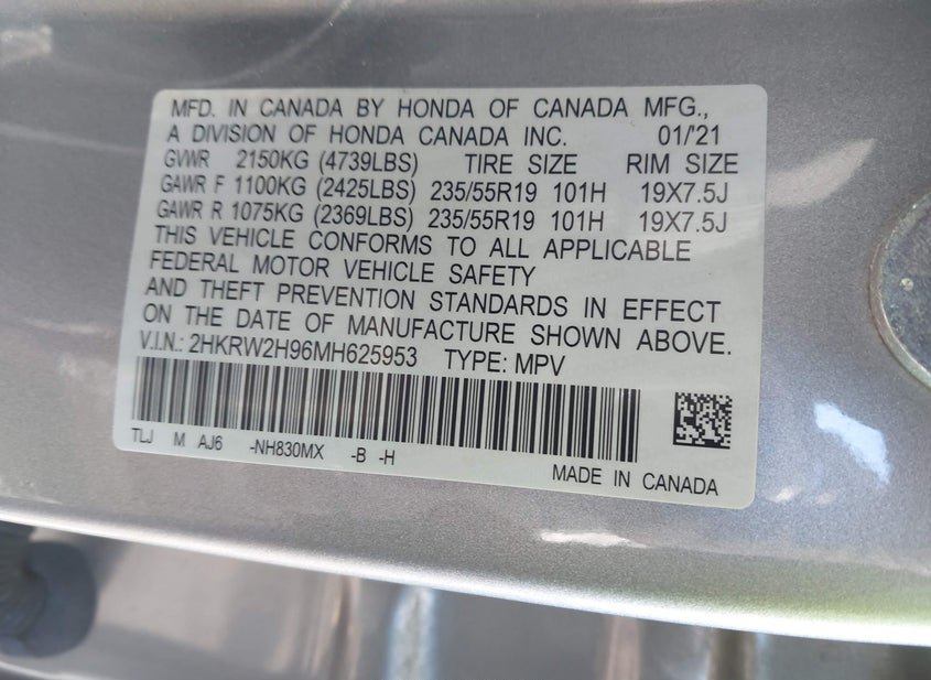- VIN: 2HKRW2H96MH625953