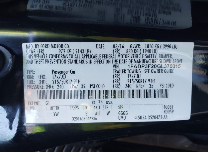 - VIN: 1FADP3F20GL370015