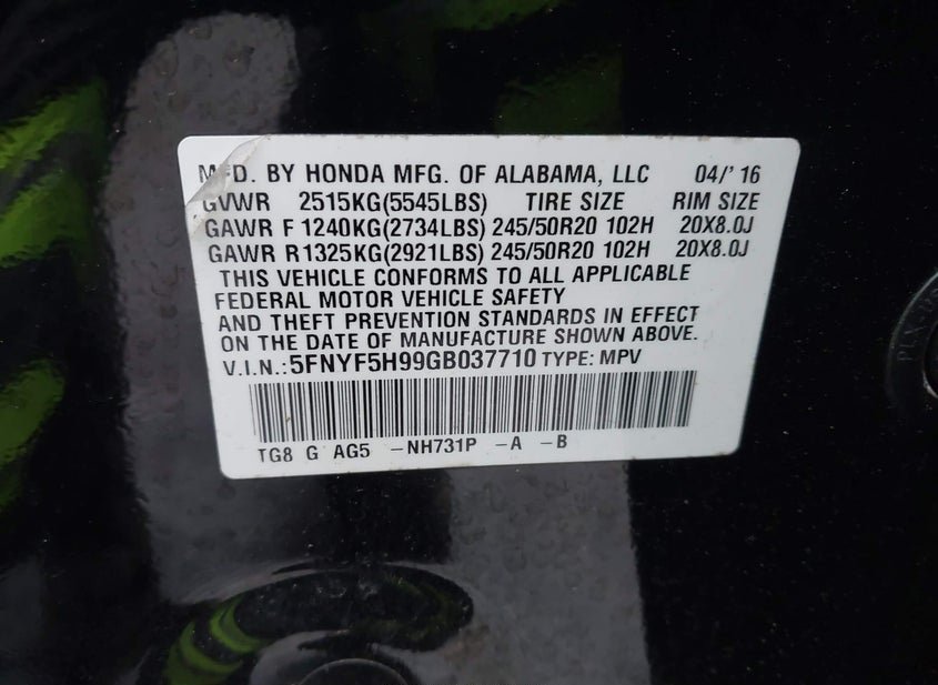 - VIN: 5FNYF5H99GB037710