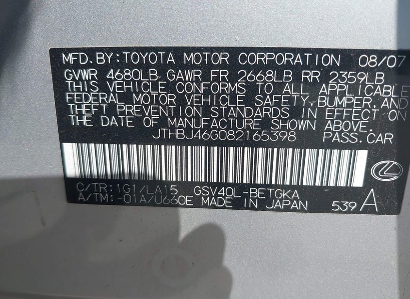 - VIN: JTHBJ46G082165398