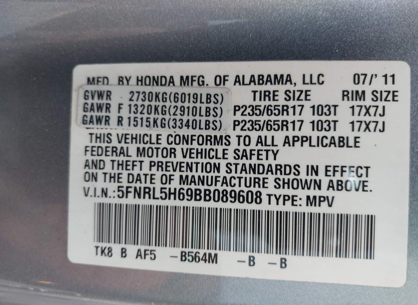 - VIN: 5FNRL5H69BB089608