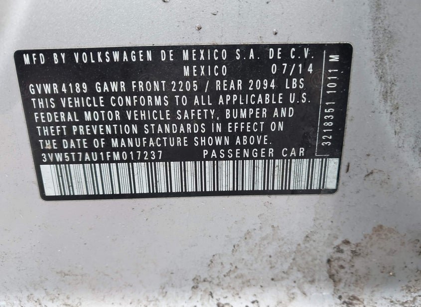 - VIN: 3VW5T7AU1FM017237