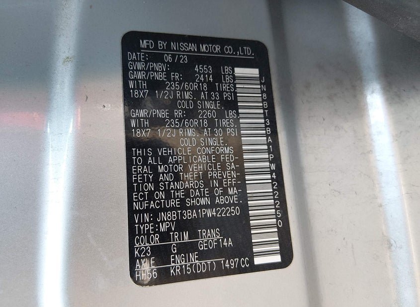 - VIN: JN8BT3BA1PW422250