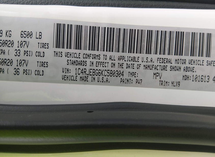 - VIN: 1C4RJEBG6KC580304