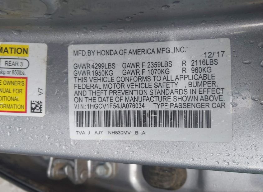 - VIN: 1HGCV1F54JA076034