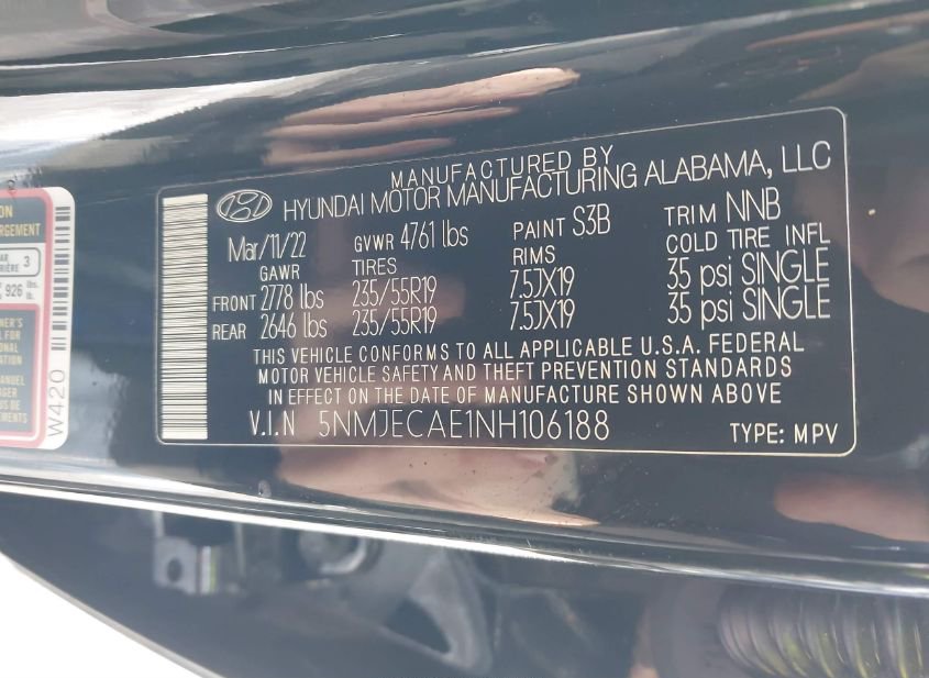- VIN: 5NMJECAE1NH106188
