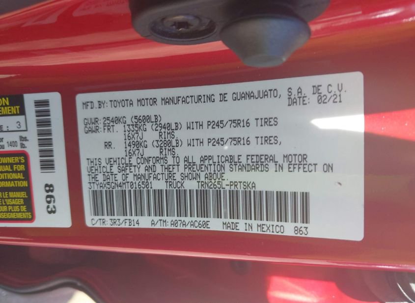 - VIN: 3TYAX5GN4MT016501