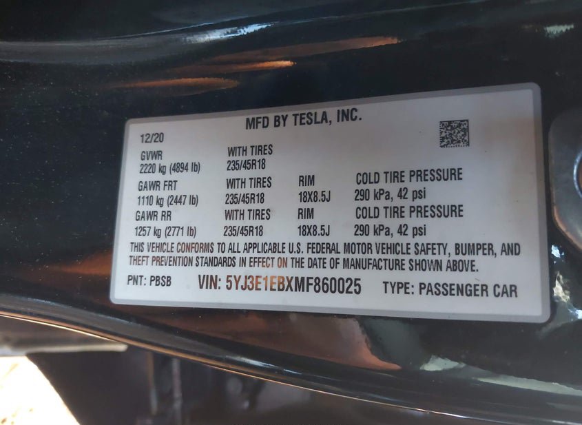 - VIN: 5YJ3E1EBXMF860025