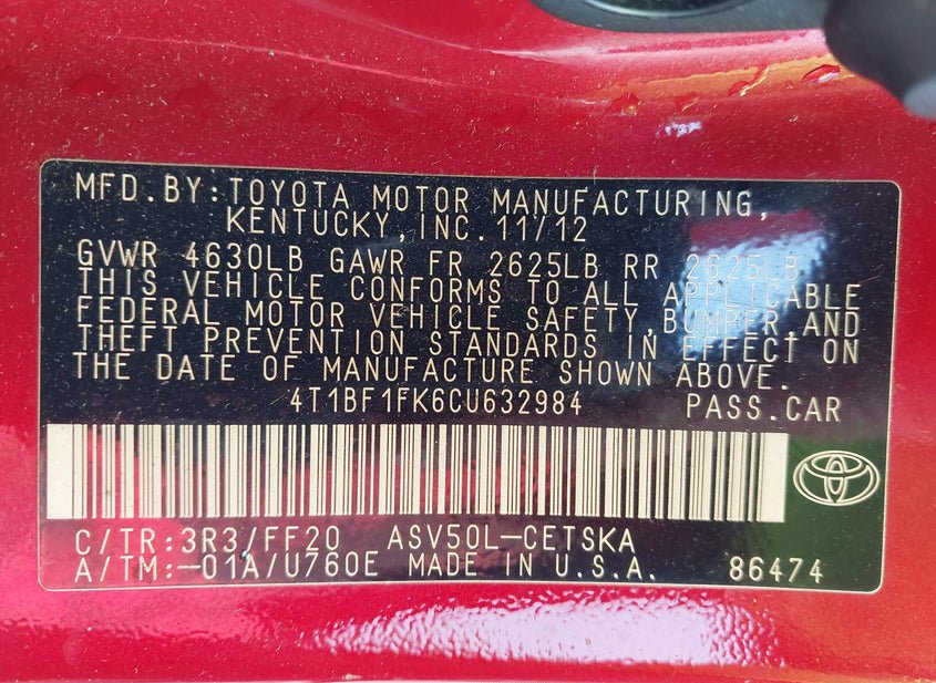 - VIN: 4T1BF1FK6CU632984