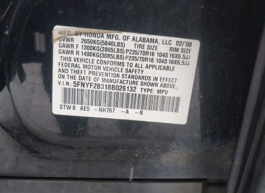 - VIN: 5FNYF28318B026132