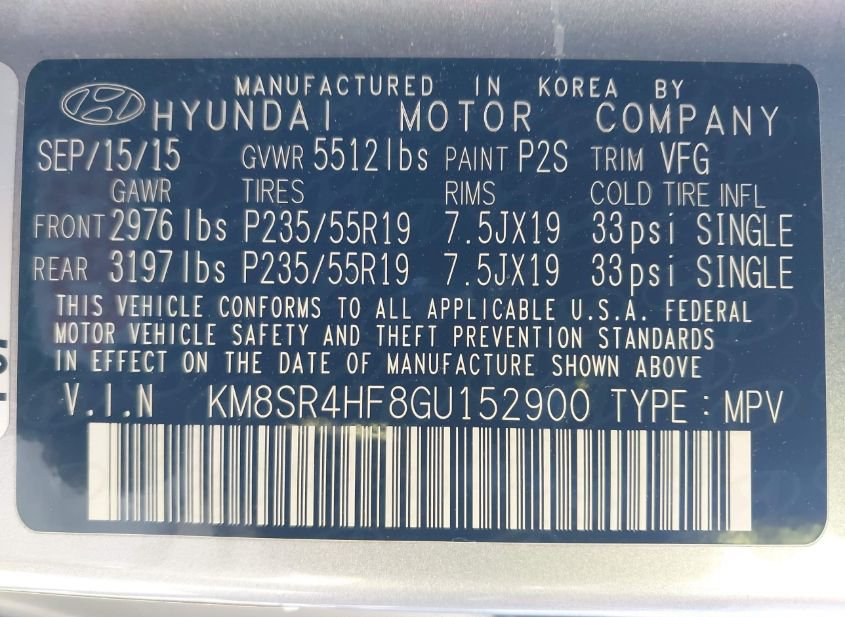 - VIN: KM8SR4HF8GU152900