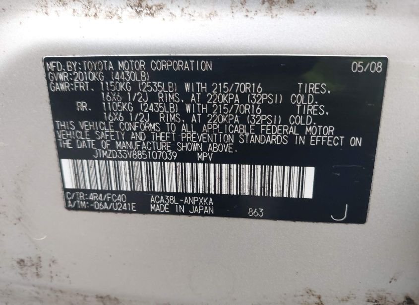 - VIN: JTMZD33V885107039