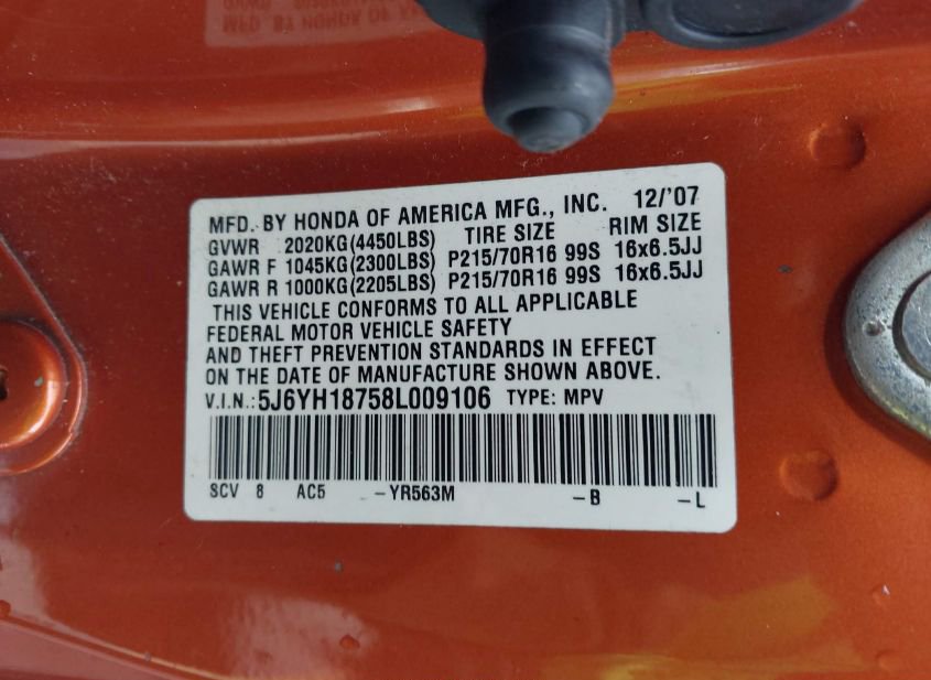 - VIN: 5J6YH18758L009106