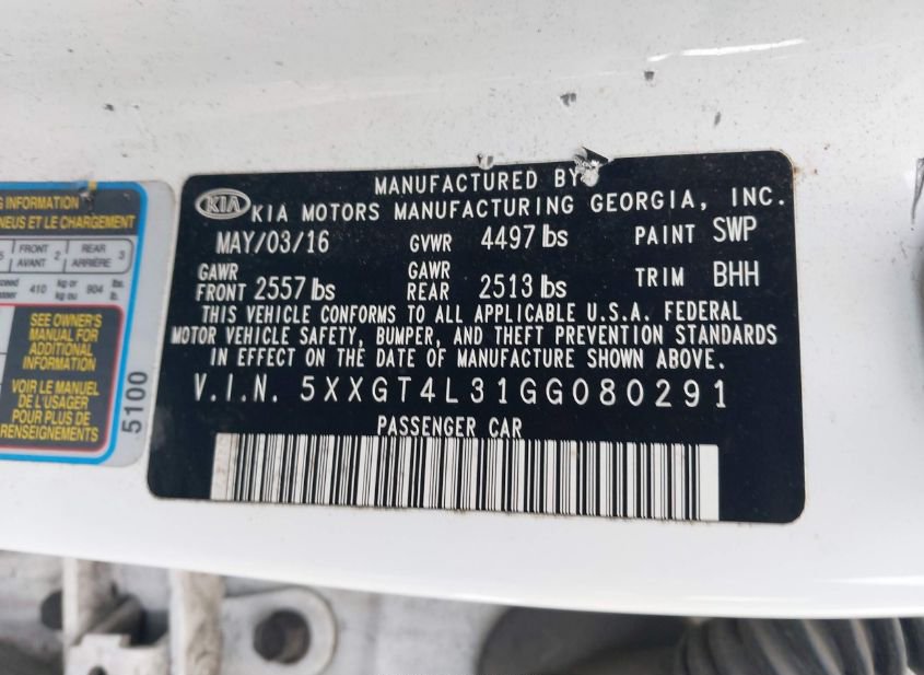 - VIN: 5XXGT4L31GG080291