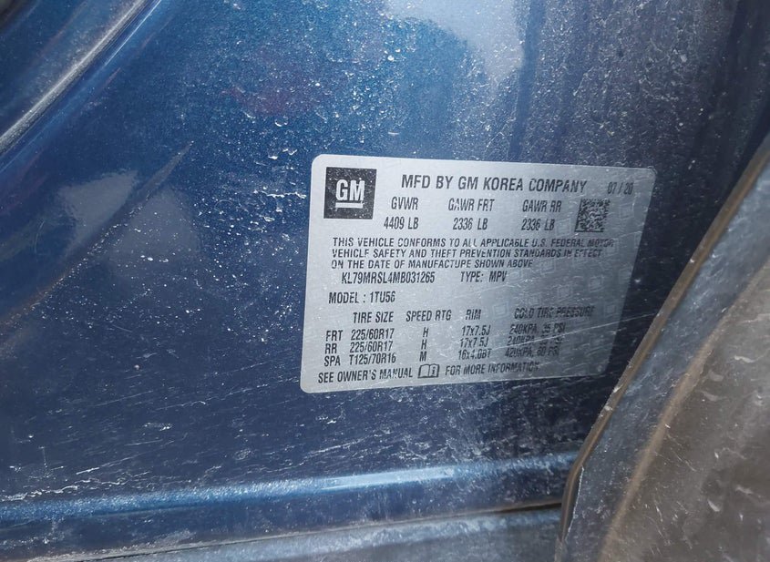 - VIN: KL79MRSL4MB031265