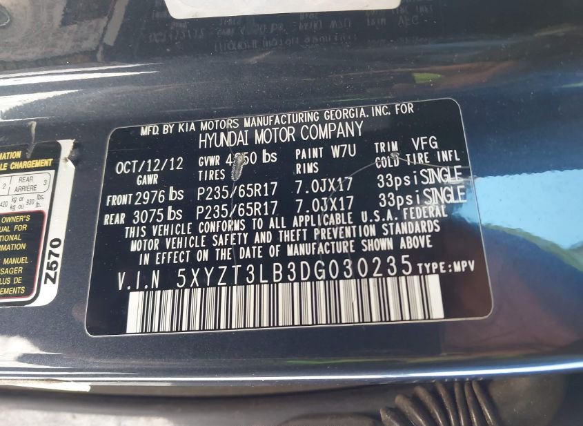 - VIN: 5XYZT3LB3DG030235