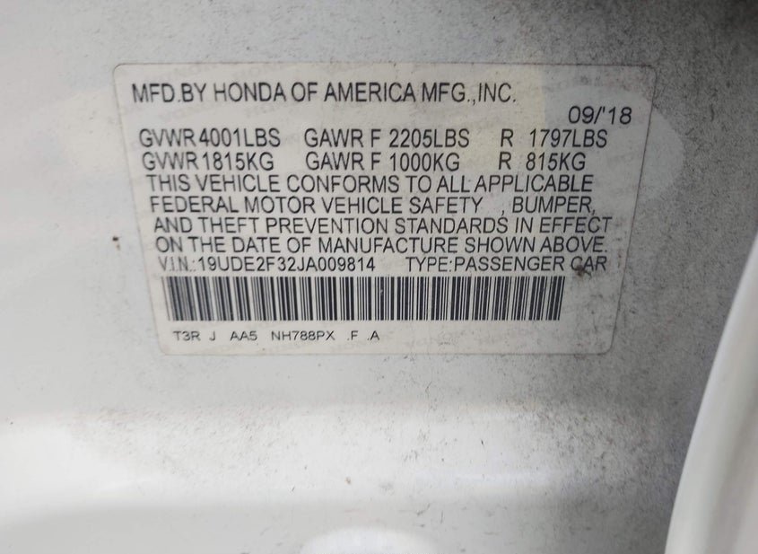 - VIN: 19UDE2F32JA009814