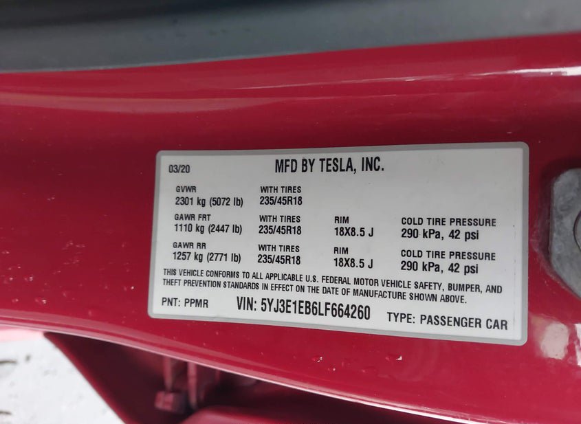 - VIN: 5YJ3E1EB6LF664260