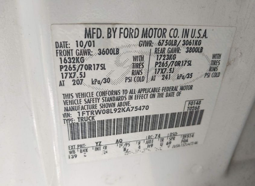 - VIN: 1FTRW08L92KA75470