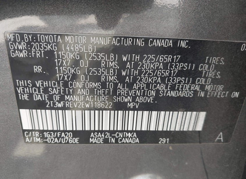- VIN: 2T3WFREV2EW118622