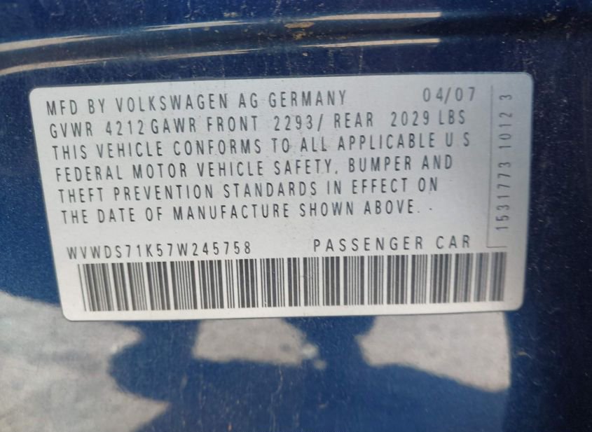 - VIN: WVWDS71K57W245758