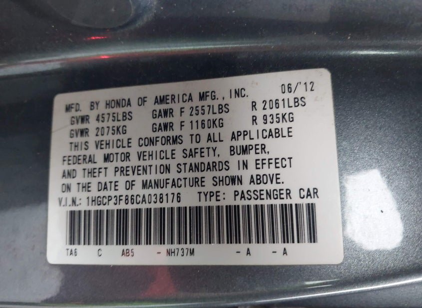 - VIN: 1HGCP3F86CA038176
